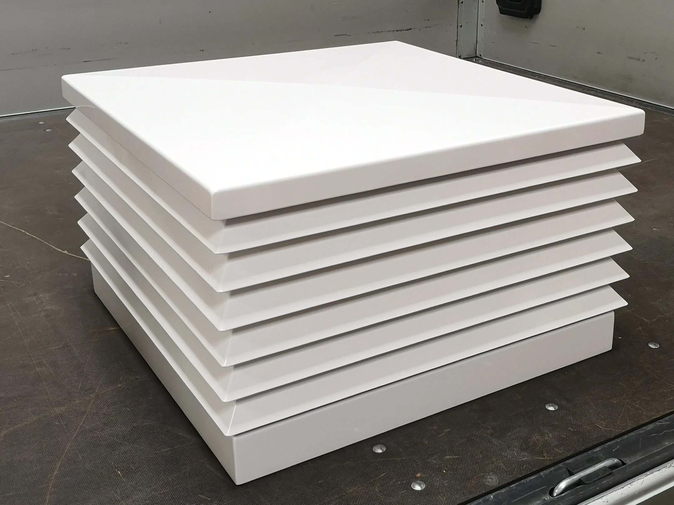 Modelo A/32 SANT CUGAT, el modelo más fabricado para cubrir cajones de obra, metálicos, madera, con faldón lateral inferior para estanqueizar; adapatable a cajones pegados a paredes o cubremuros; se fabrica en otras formas (ovalado, triangular, forma de L) y con suplemento de altura, todo siempre a medida.